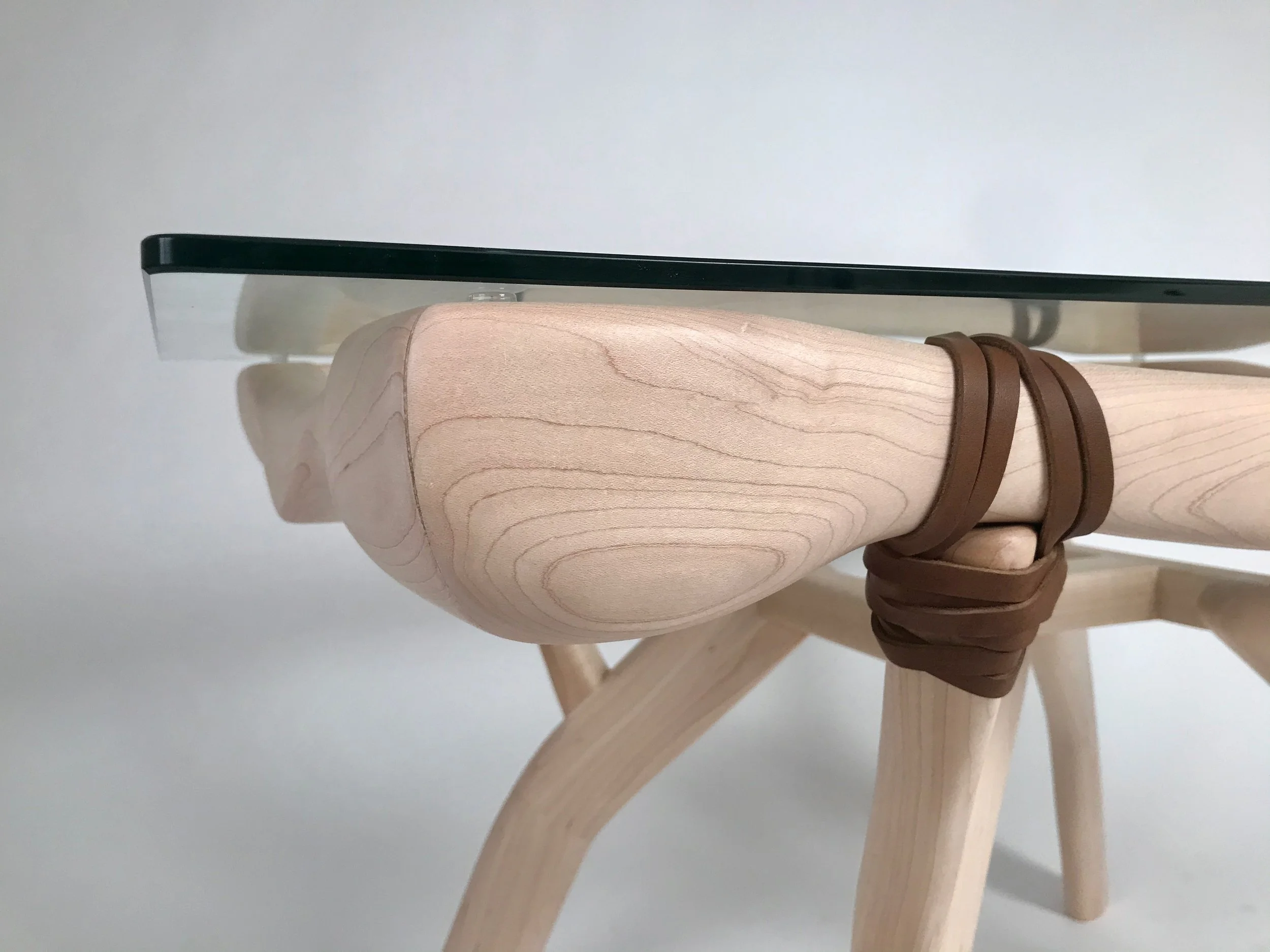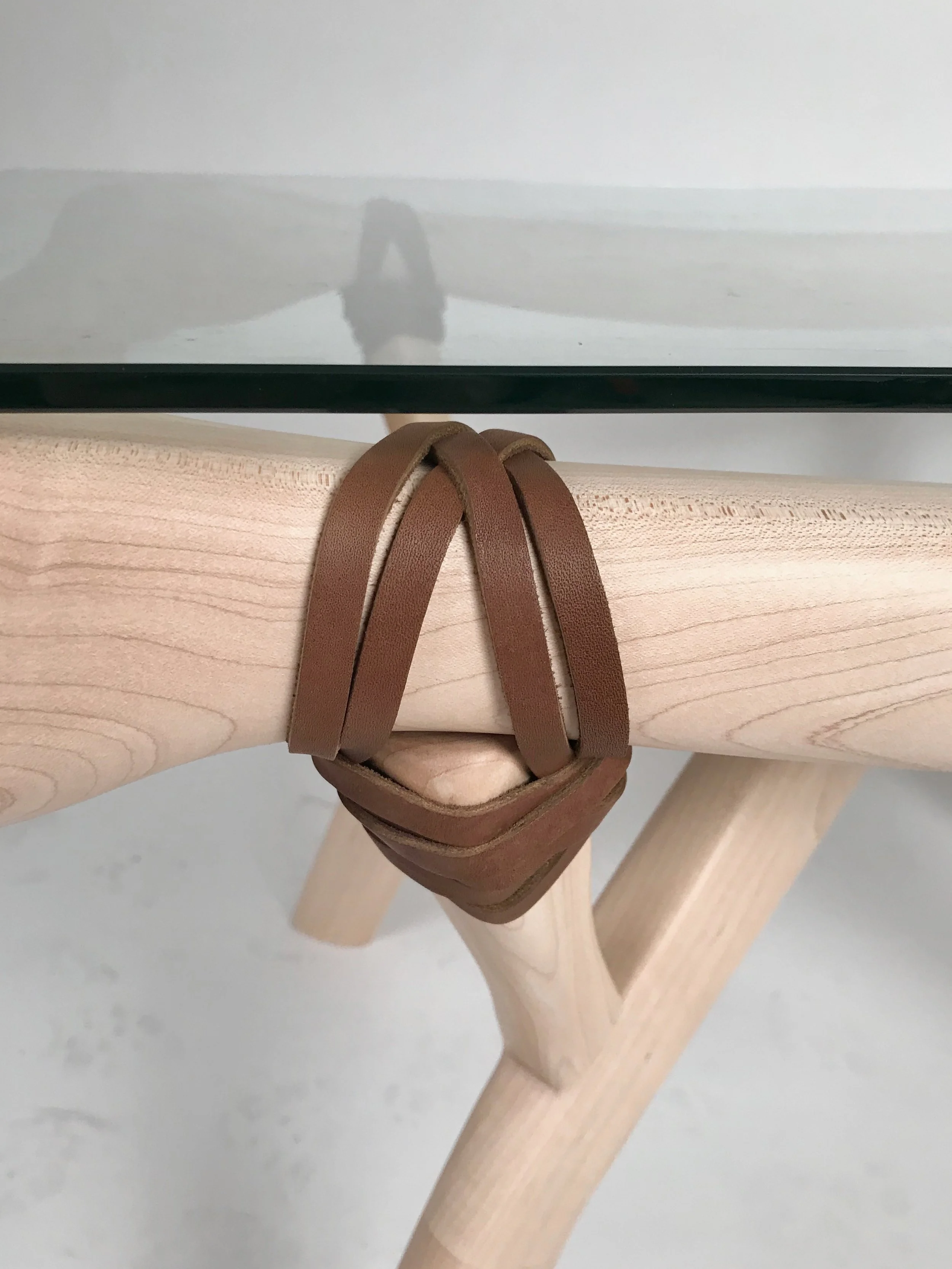 Hard maple finished with three coats of matte polyurethane, leather lashing, and tempered glass table top