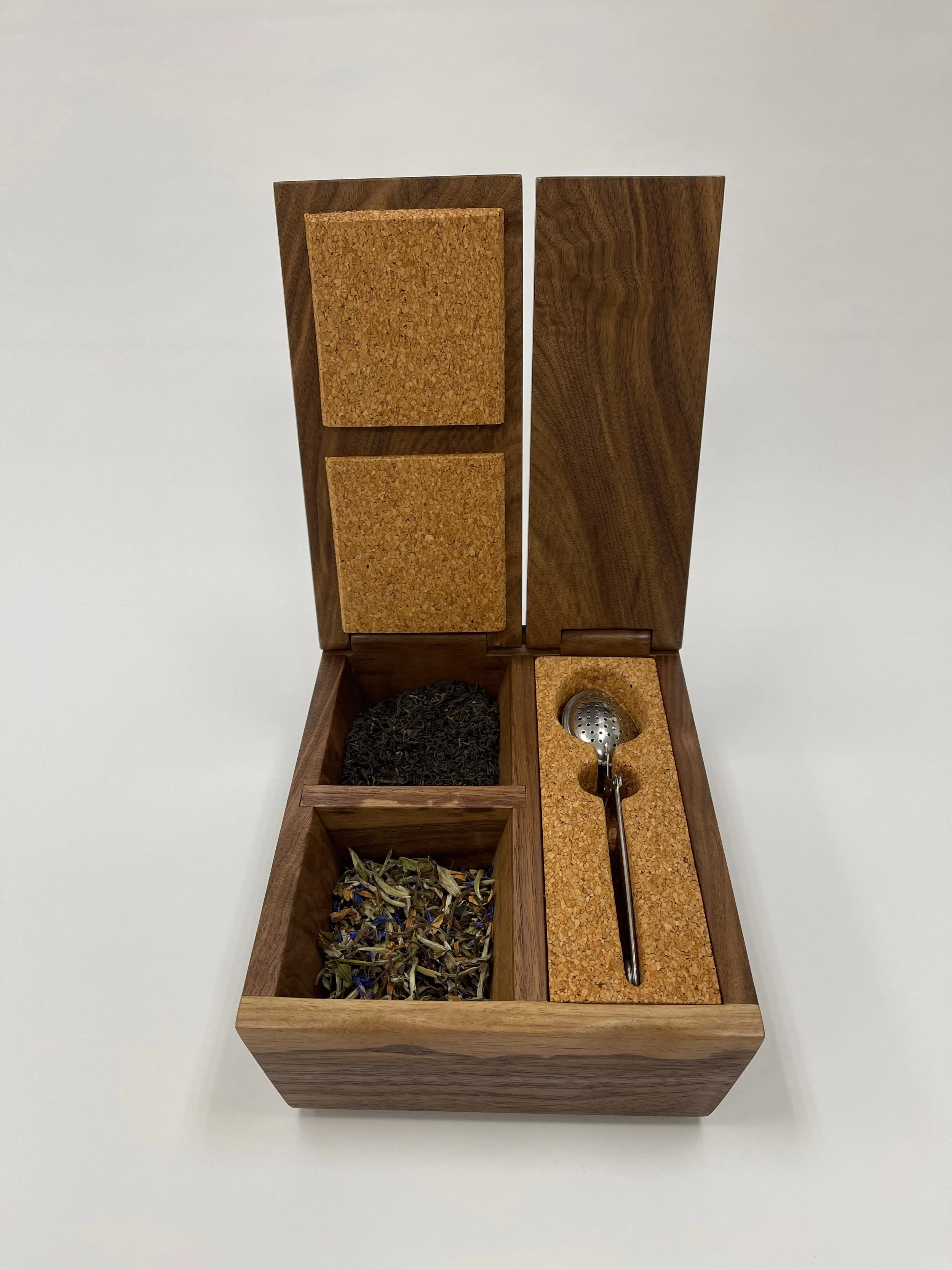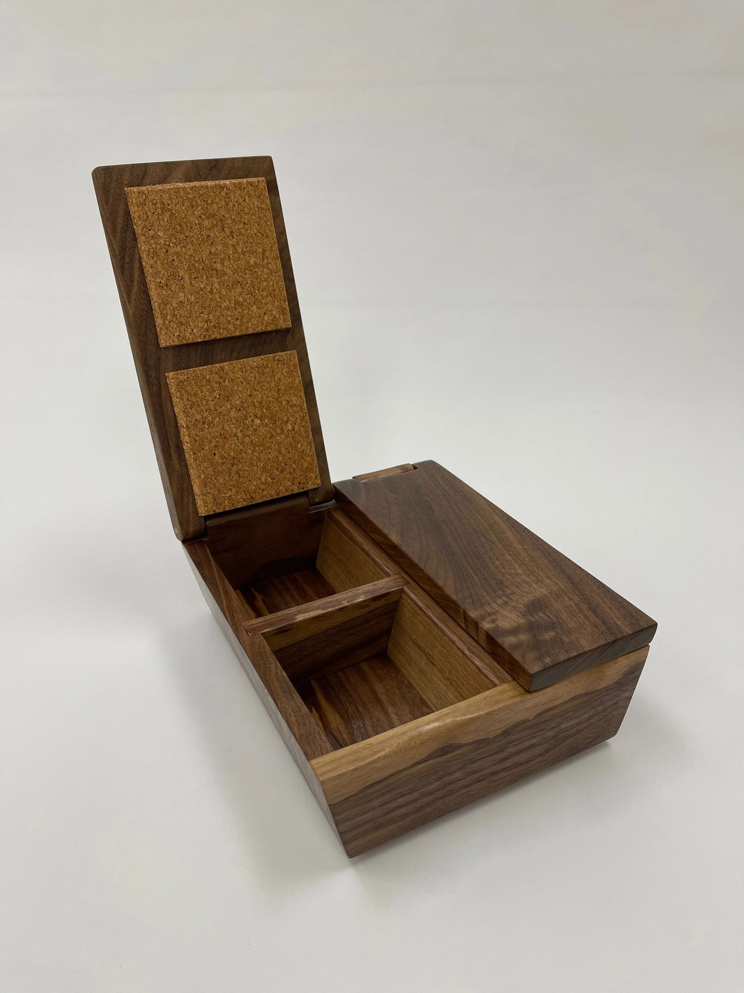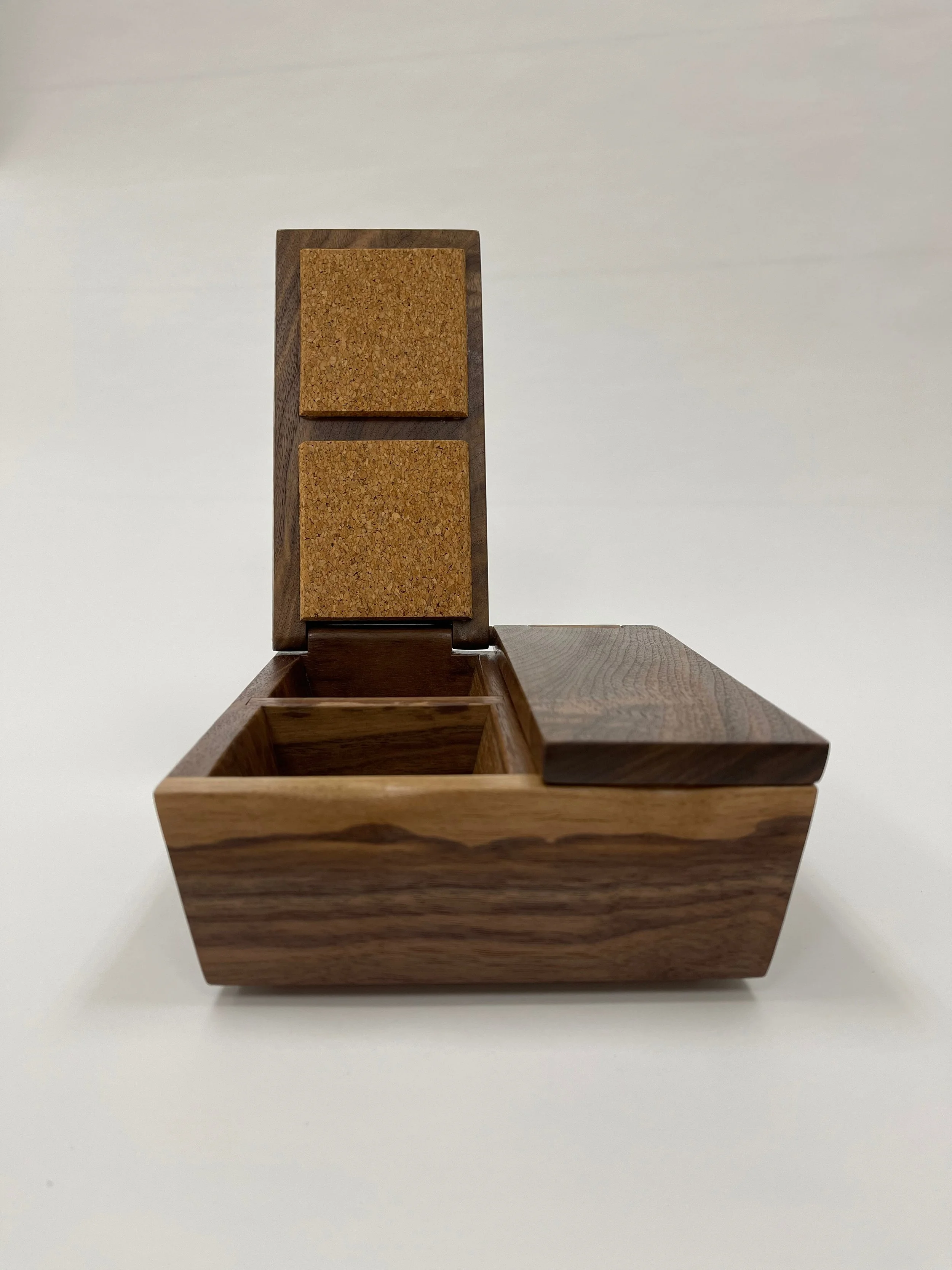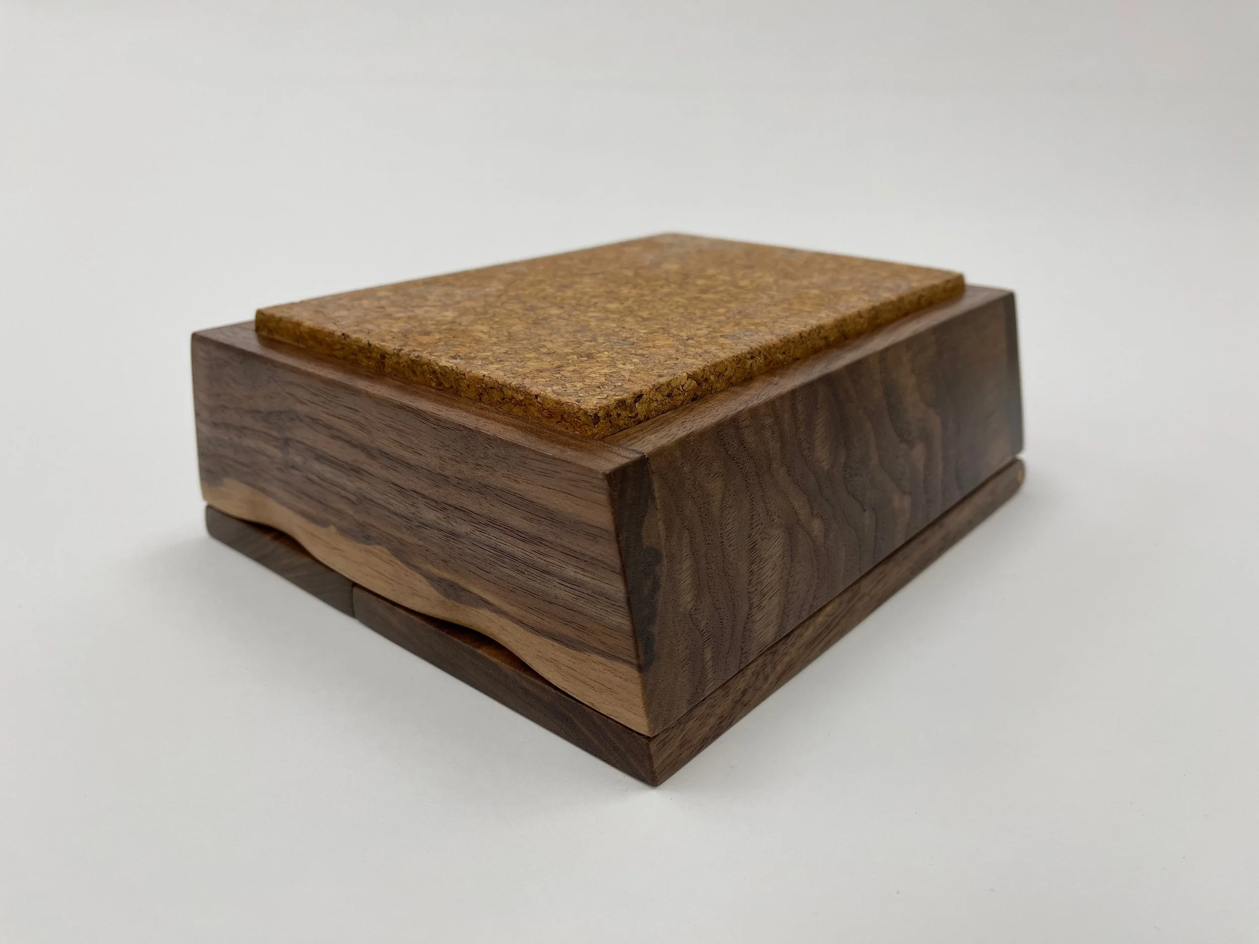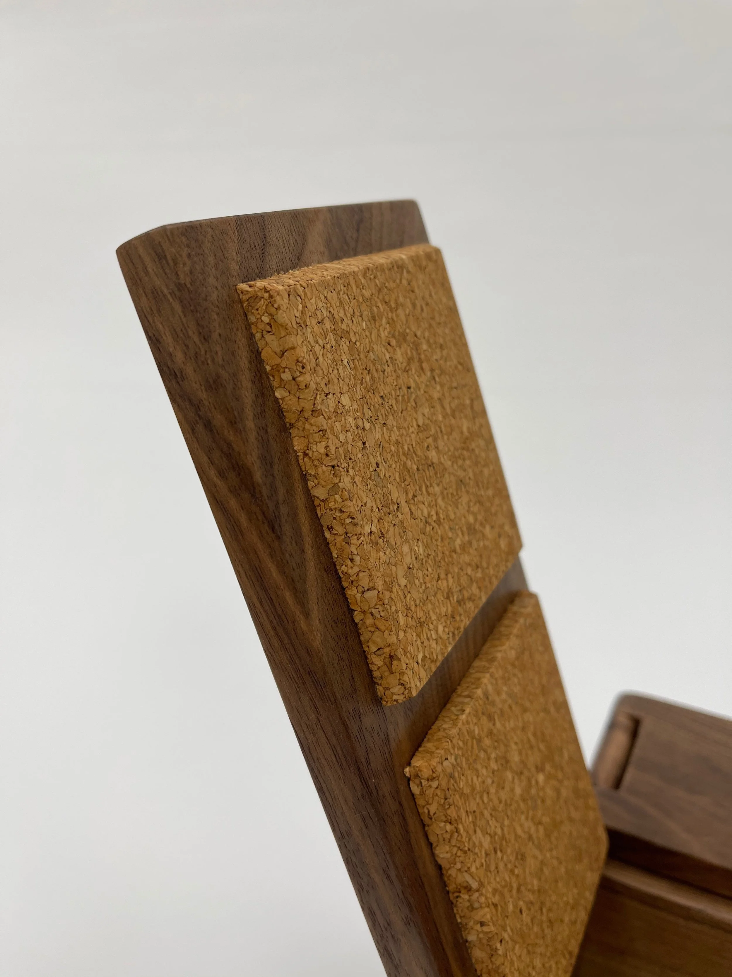 Walnut and cork with an integral hinge, finished with two coats of salad bowl oil