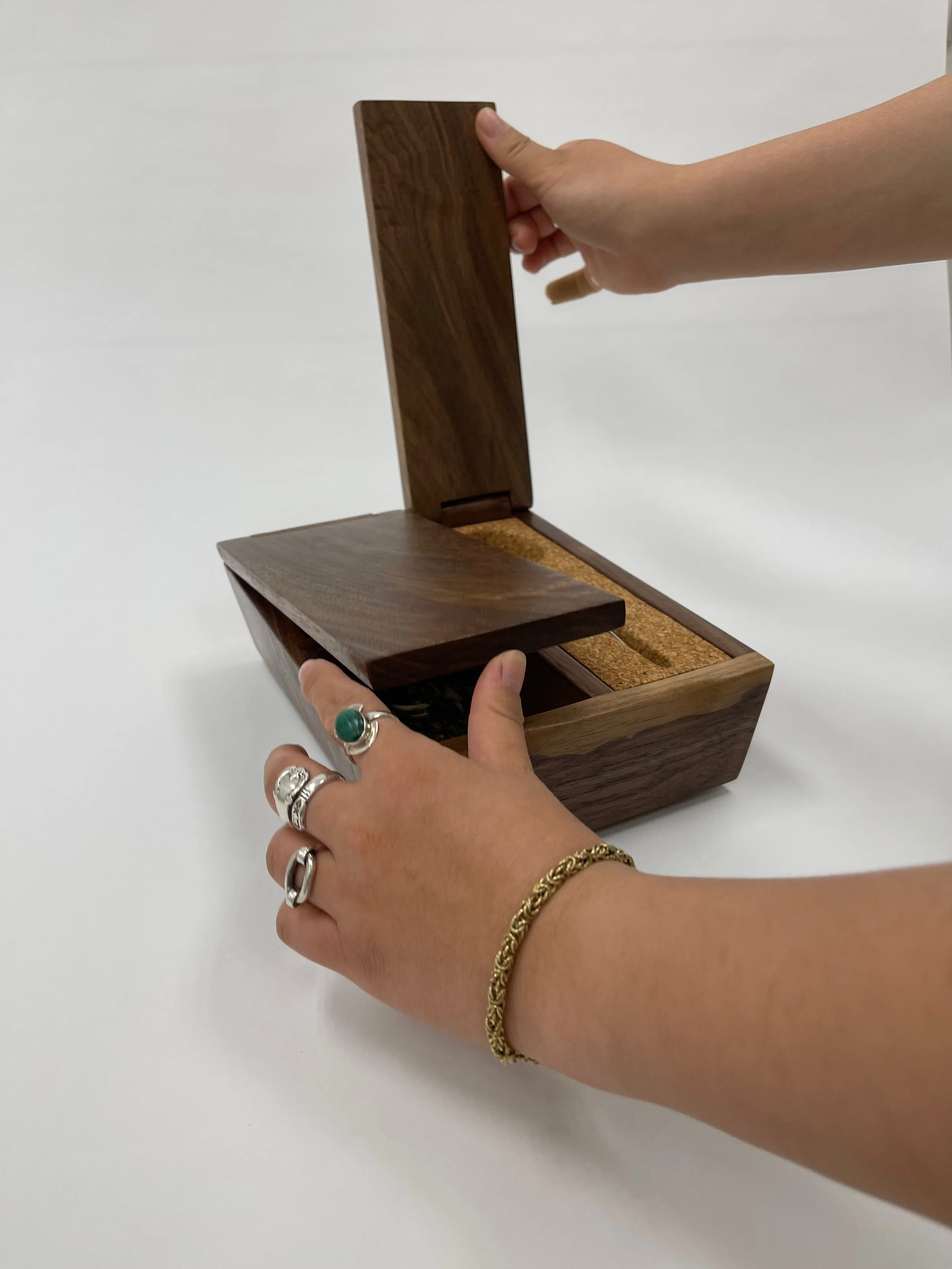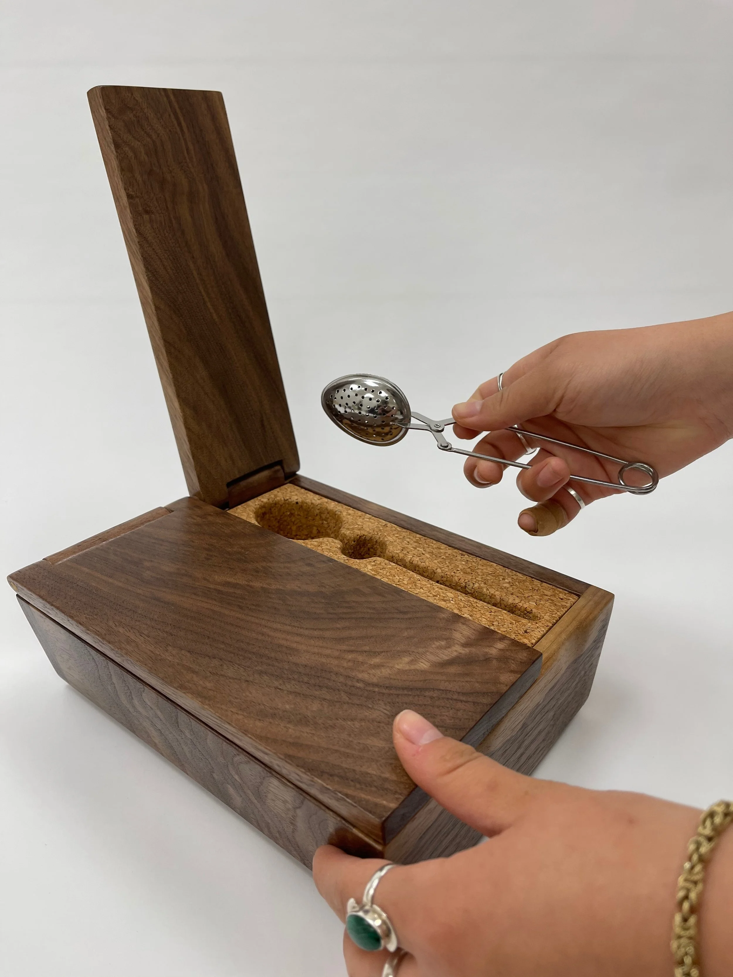 For this project, I was asked to design a build a box with an intended purpose. Through reflection on the instances in my life where I value intentional storage, I focused in on my relationship with tea and the personal rituals/practices I have created throughout my experience and exploration. I set out to create an embodied experience, one which heightens the tactile and visual aspects of the process of making tea opening the door for individuality within habitual ritual.