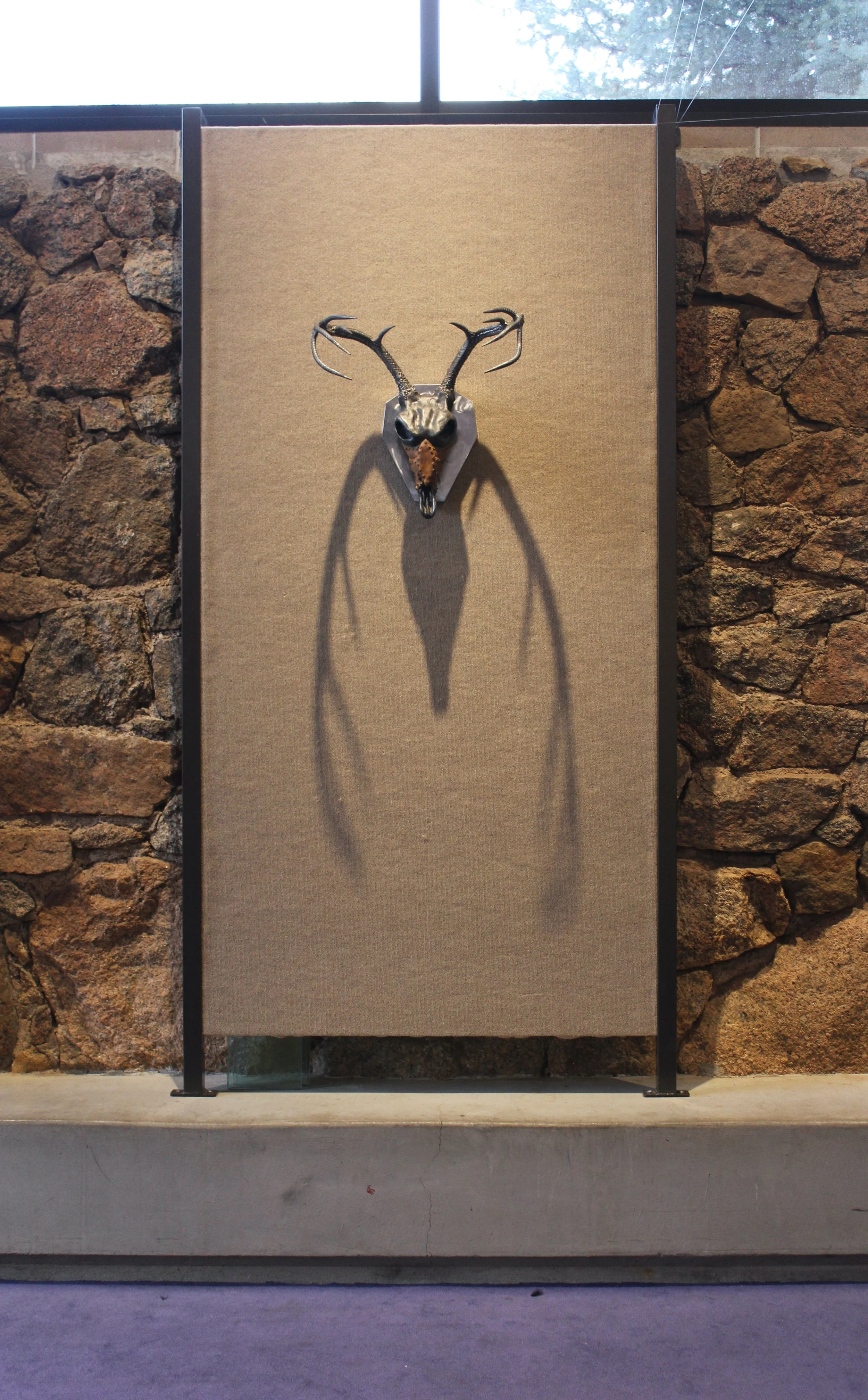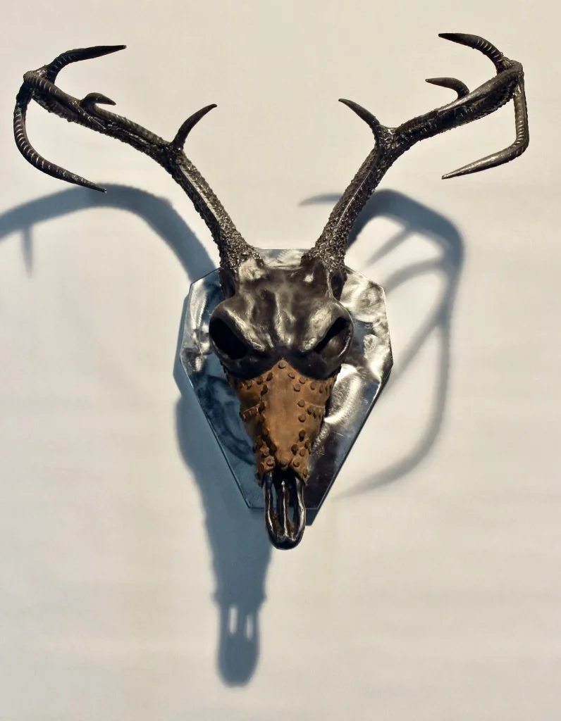 This piece was made using the lost wax casting method at the annual Bliss studio and gallery iron pour in Monument, Colorado in 2019. The antlers started as a straight billets of rebar forged at one end. A mold was then made of the skull with the billets sticking out of the wax and the rebar was cast into the cast iron. After the metal cooled, the rebar was bent to shape and welded to give a more realistic texture. The “leather” panels on the front are patina’d cast iron with concrete nails stuck into the wax positive before molding. The mounting plate was fabricated out of steel. This piece won “3D Best in Show” at the 57th Annual Young People Art Exhibition as well as a Gold Metal in sculpture at the “2019 Scholastic Art and Writing Awards”